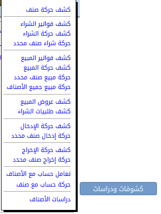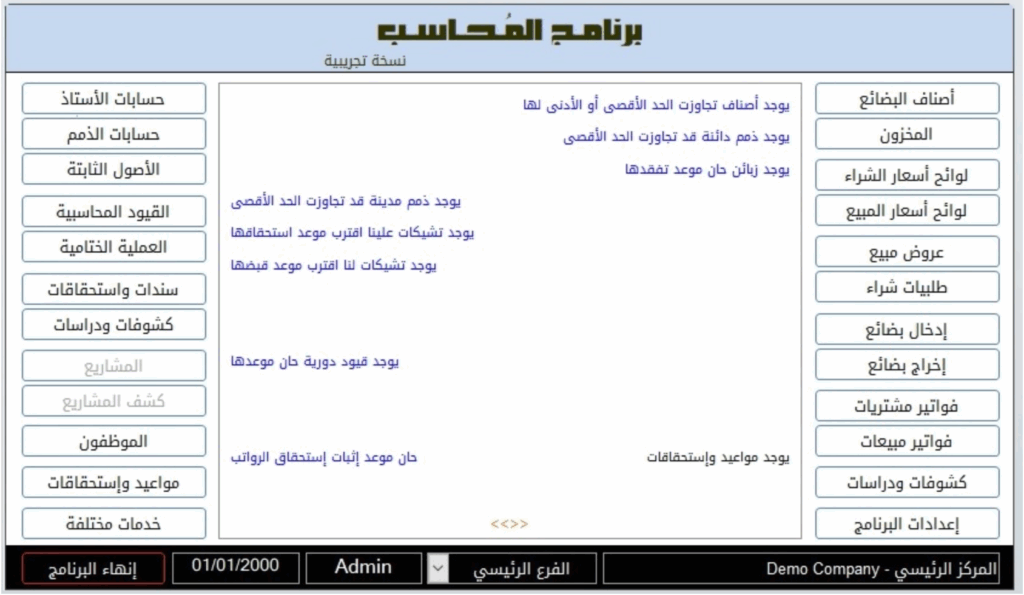 - القسم الأيمن: يتضمن كل النوافذ المتعلقة بحركة البضائع والمخزون والدراسات المرتبطة بها.