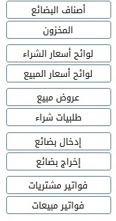 يضم هذا القسم: المواد Items، الخدمات Services، المخزون Inventory، لوائح الأسعار Price lists، عروض المبيع Offers، طلبيات الشراء Orders، فواتير إدخال وإخراج البضائع، فواتير الشراء والمبيع Invoices.
